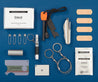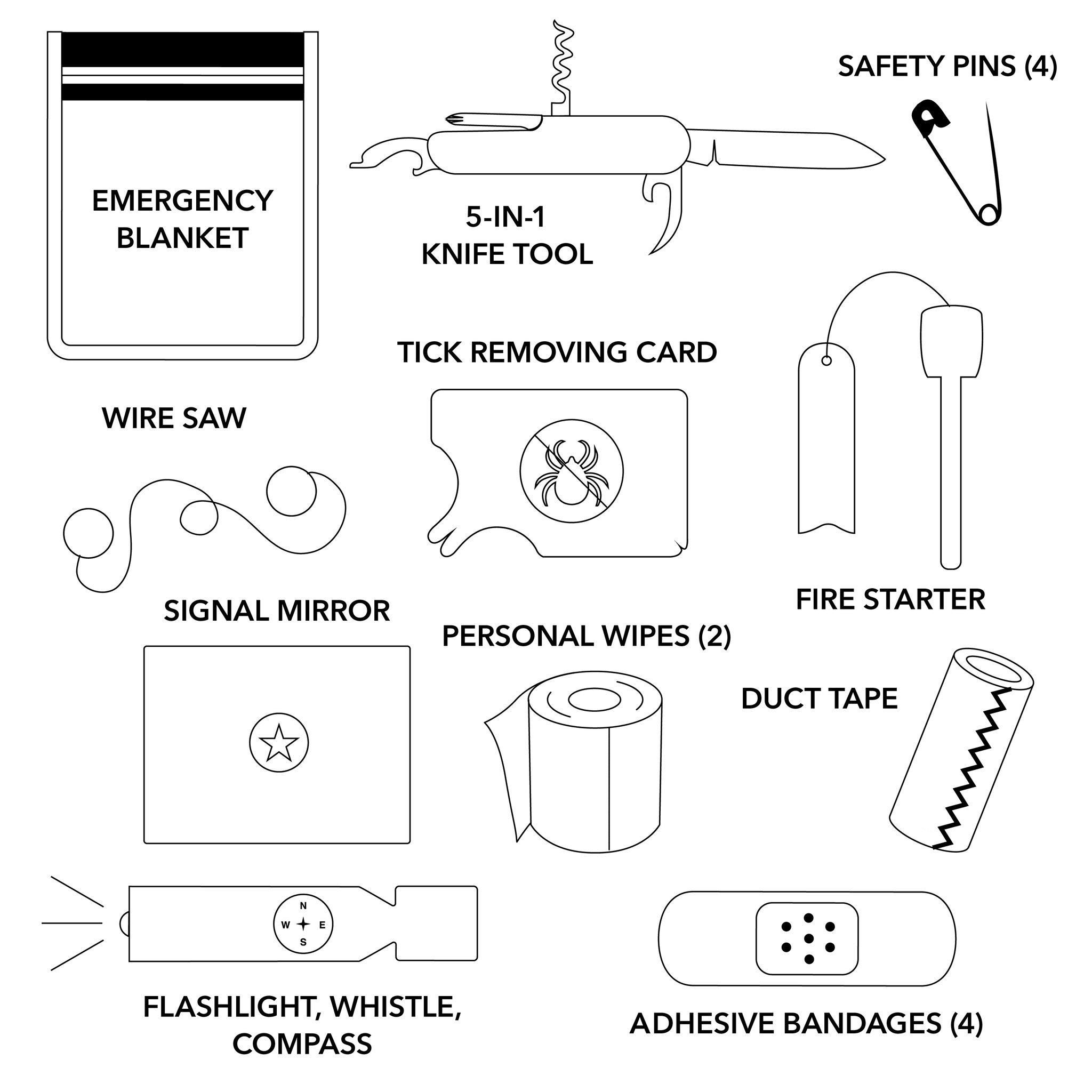 Enjoy a night under the stars with our new "Happy Camper" Camping Kit. This navy vegan leather pouch is filled to the brim with 13 must-haves for any outdoor outing. These essentials include an emergency blanket, fire starter, tick removing card, duct tape, safety pins, signal mirror, adhesive bandages, combination flashlight-compass-whistle, wire saw, 5-in-1 multitool, and personal wipes. Ideal for gender-neutral or men's holiday gifting displays. Part of the Pinch Adventure Collection, with hiking, fishing, and golf options.